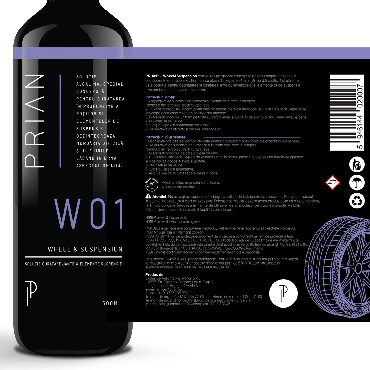 Prian® Wheel&Suspension este o soluție special conceputa pentru curatarea rotilor si a componentelor suspensiei. Formula sa alcalină reuseste sa sparga murdăria dificila și uleiurile. Este potrivita pentru degresarea si curatarea jantelor, anvelopelor si elementelor de suspensie precum brate, arcuri, amortizoare etc.